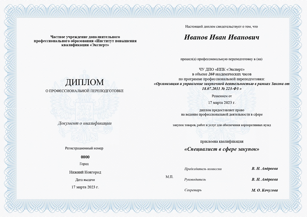 С выдачей Диплома о профессиональной переподготовке по 223-ФЗ с присвоением квалификации - Специалист /эксперт в сфере закупок: